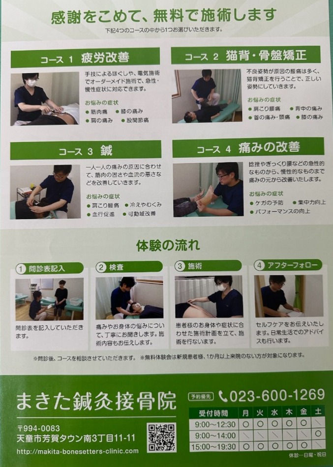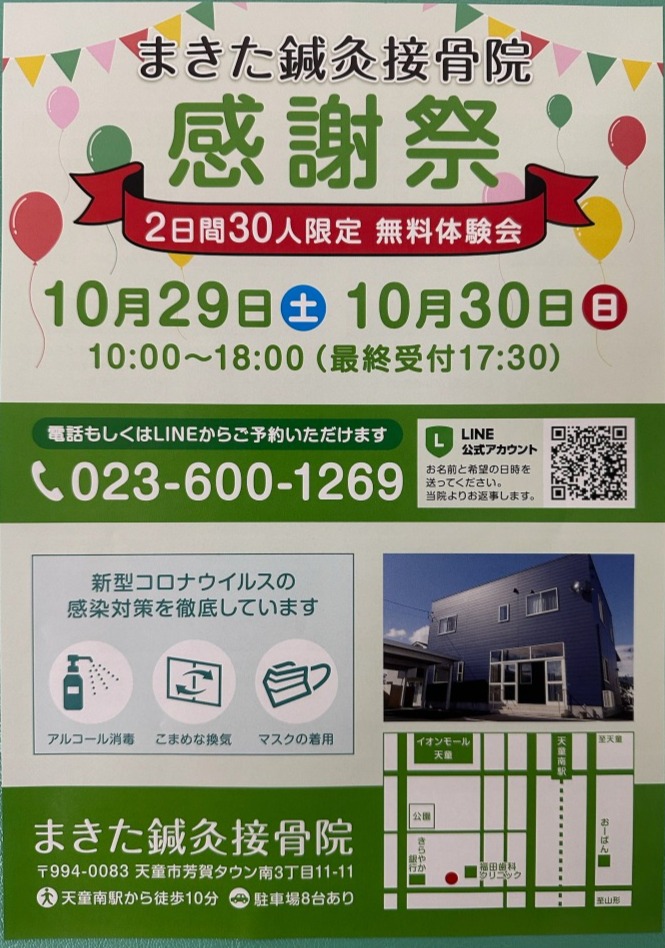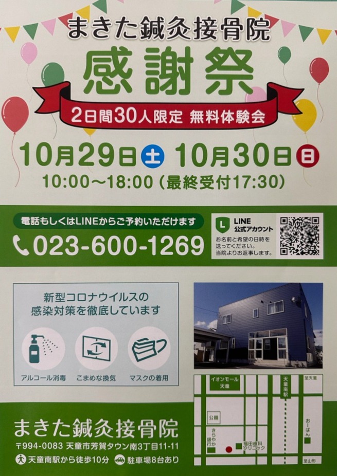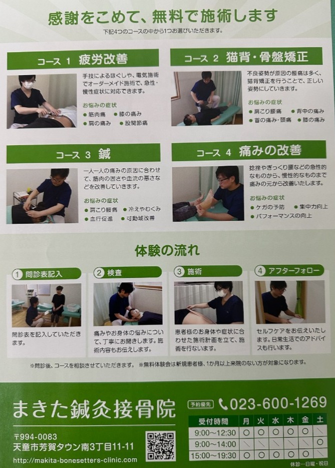 まきた鍼灸接骨院2周年を迎えまして感謝際を行うことになりました。内容は10月29日(土)、10月30日(日)に2日間30人限定の無料体験会となっています。4つのコースから選んでもらって施術を受けてもらう感じになります。