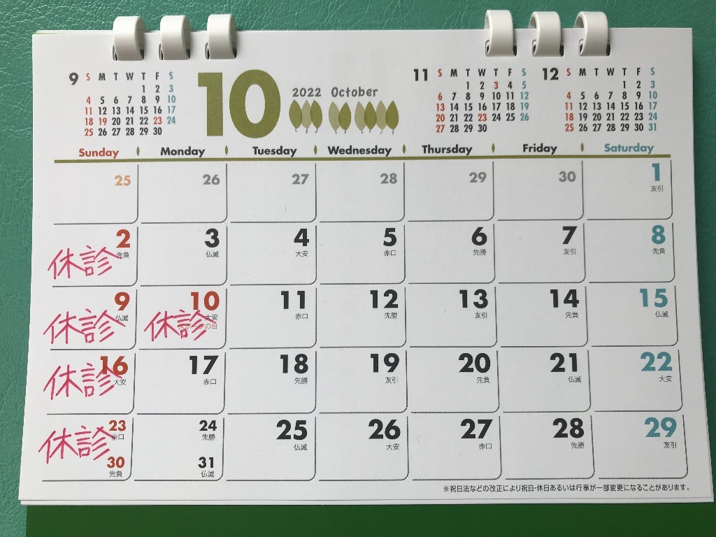 少し遅くなりましたが10月の診療案内になります。休診日はカレンダー通りに日、祝日がお休みになります。ご確認のうえご予約お待ちしております。